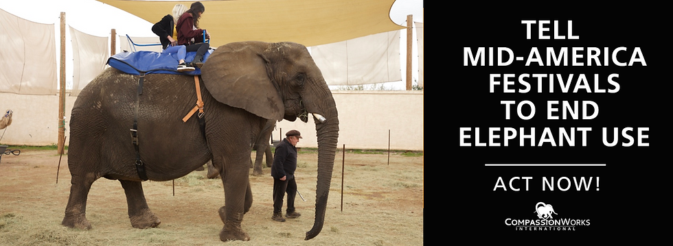 We are sad to share that the Bay Area festival begins on February 14, and their website lists elephant rides amongst their "games and rides". Apparently, Mid-America Festivals has not yet gotten the message that the archaic and cruel use of elephants for rides MUST END.